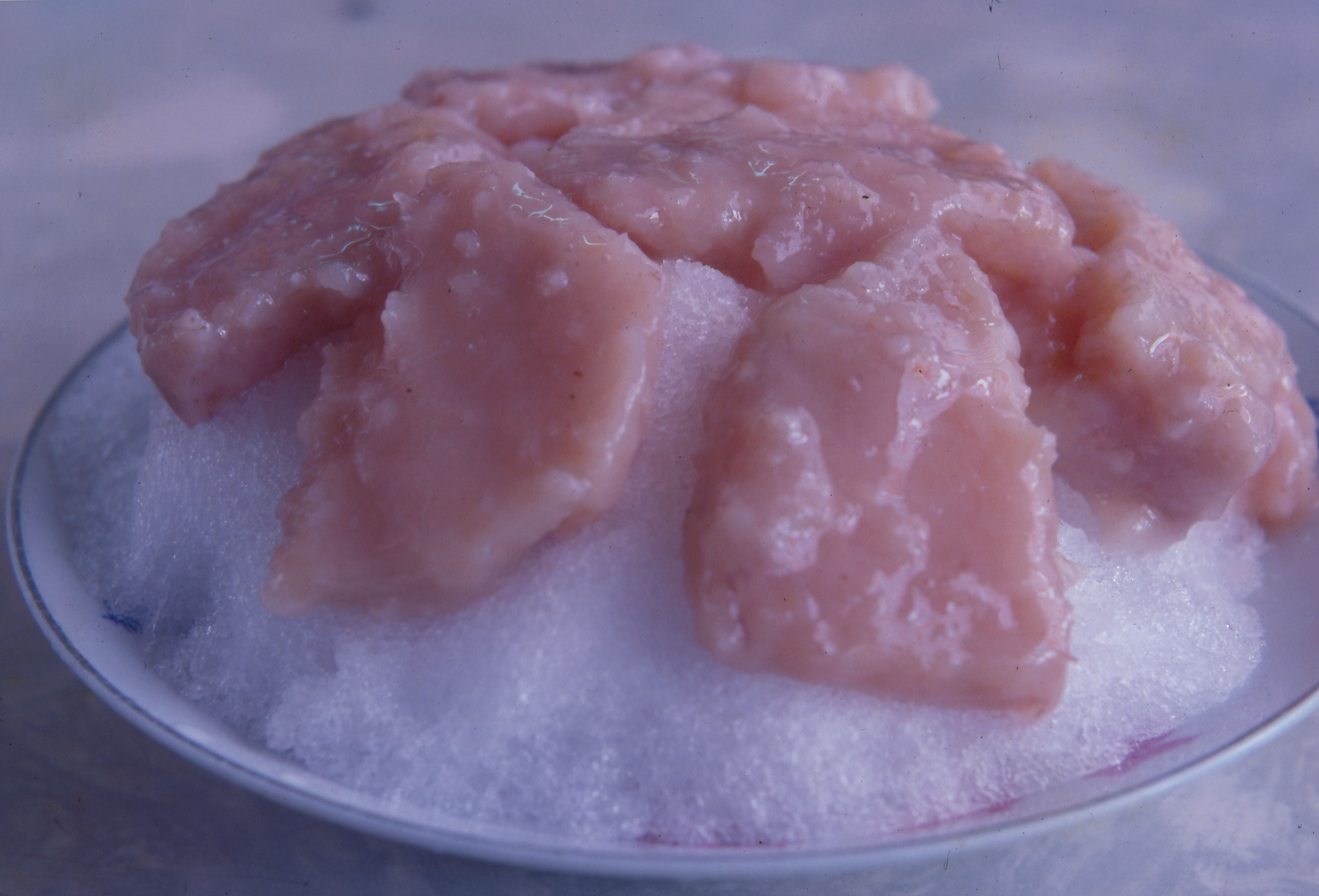 Before the advent of refrigerators, ice had to be taken from frozen rivers and lakes in winter and buried deep in the ground to await the summer. During the Chou dynasty, this ritual became so important that a special official known as a Ling Jen supervised its operation. First of all, the ice was buried in an underground cavern on the shady side of the mountain. The compartment was covered with earth, and a pavilion was constructed to provide further protection from the sun. At that time, the ice was considered a treat suitable only for members of the imperial court or their guests. In the Ching dynasty, however, ordinary people would gather ice for later resale to streetside stalls or fish markets. The only problem was that the ice became impure from its long internment.