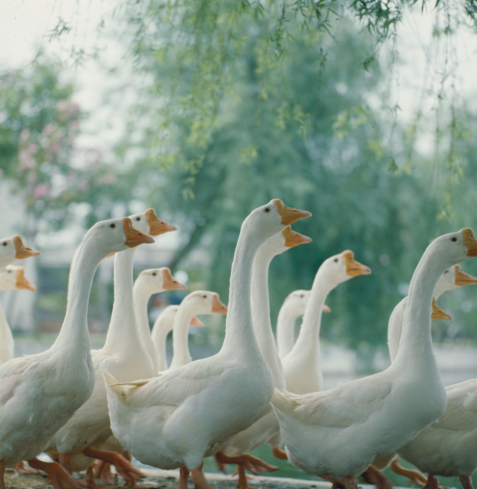 He said that geese are obedient to their master. They follow him to and from their coops to the pond in an orderly fashion. They may advance toward a stranger and honk to call their master's attention to any intrusion, making them excellent guards.