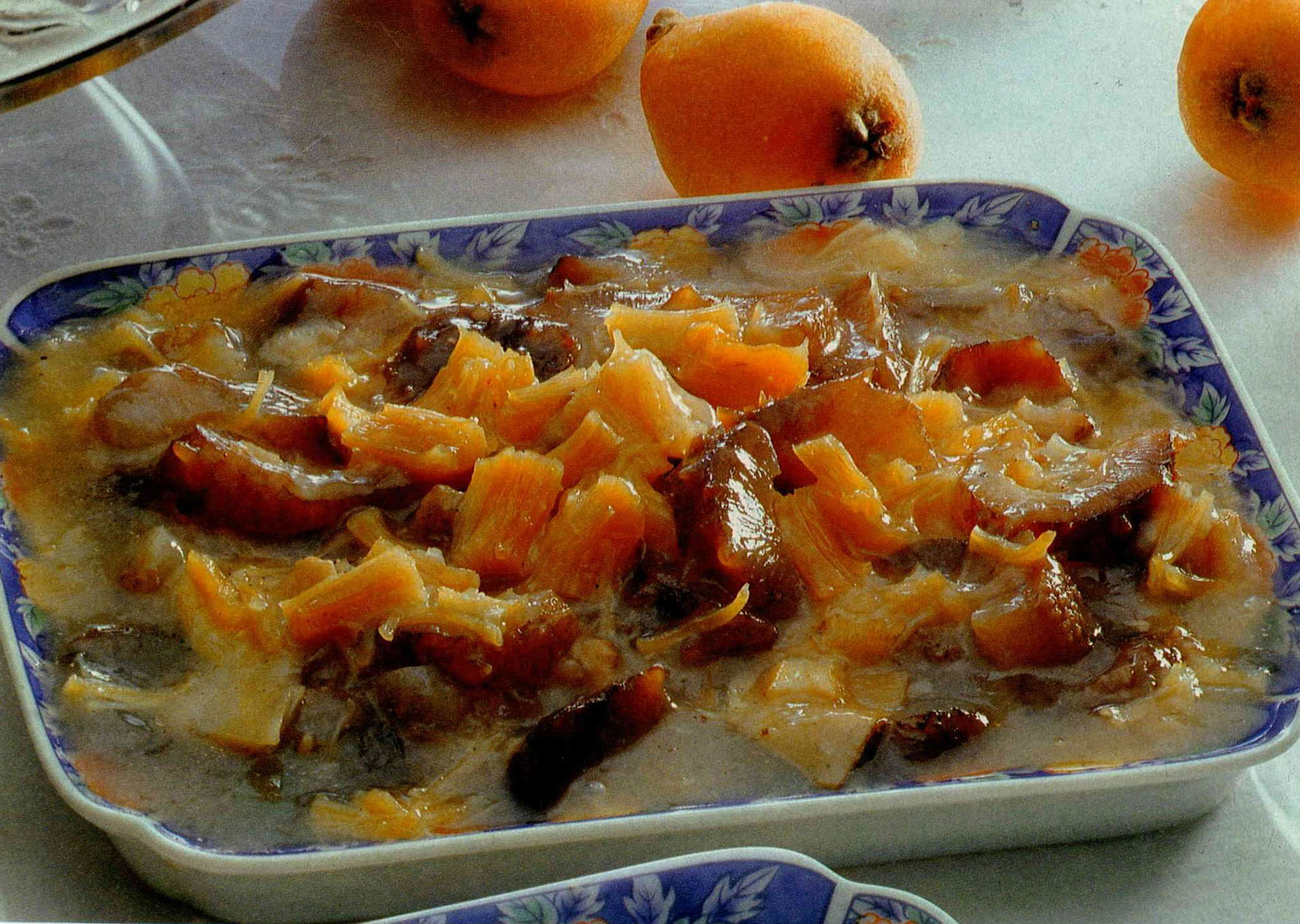 1. Wash the dried scallops and soak in the Shaohsing or other rice wine along with 1 cup of the chicken stock for 2 hours. Steam the scallops along with liquid for 20 minutes. Cool after steaming, remove the scallops from the liquid, tear scallops into small pieces, and place in the remaining 2 cups of chicken stock.