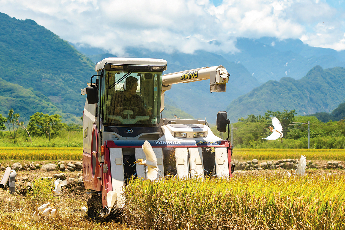 With the arrival of summer, the ripening rice in Taitung’s Chishang Township forms a sea of yellow. Wei Jui-ting gets up at 5 a.m. on a day off from his day job and fires up his harvester to reap the golden grain. It takes him three days to harvest the rice from his nine hectares of land, and send it for drying and milling.