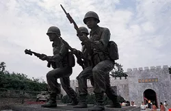 Because of its importance to the defense of coastal cities Zhangzhou and Xiamen, and as a base for extending control over Taiwan and Penghu, the island was referred to in the Ming dynasty as "an impregnable fortress dominating the gateway to the seas." The word kinmen derives from an expression meaning "impregnable fortress" (kintang) plus the word for "gateway" (men). When the ROC came to Taiwan half a century ago, it posted a huge garrison to defend this island. Since then, numerous battles have been fought with the PRC here, making Kinmen the focal point of the defense of the ROC.