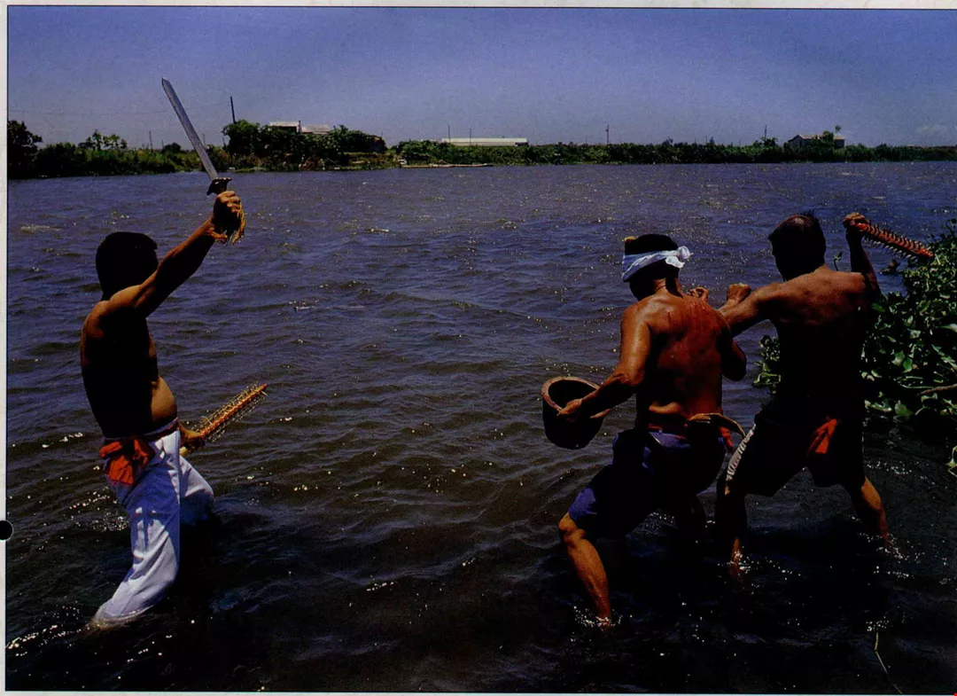 Mediums from Chih Wangyeh temple in Tainan County's Madou Township come to the river mouth to send their spirit's respects far across the water to the mother temple in Fujian.