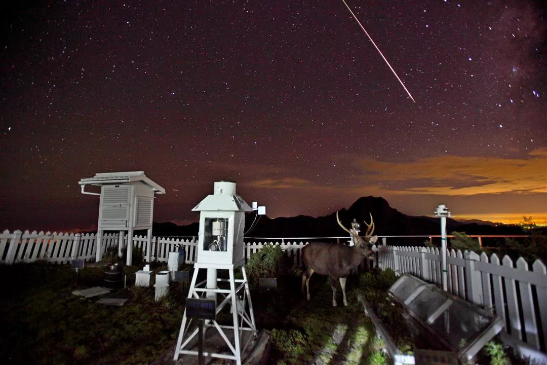 The mountain’s fauna has also entered his lens: Taiwan rosefinches, Formosan laughing thrushes, Formosan sambar deer, and yellow-throated martens have all shown it their charm. He once even captured a sambar deer standing among the instruments at the observation platform, with Yushan’s Main Peak and East Peak in the background under a starry sky, while a shooting star streaks toward Yushan’s Main Peak. It was truly a once-in-a-lifetime moment to capture.