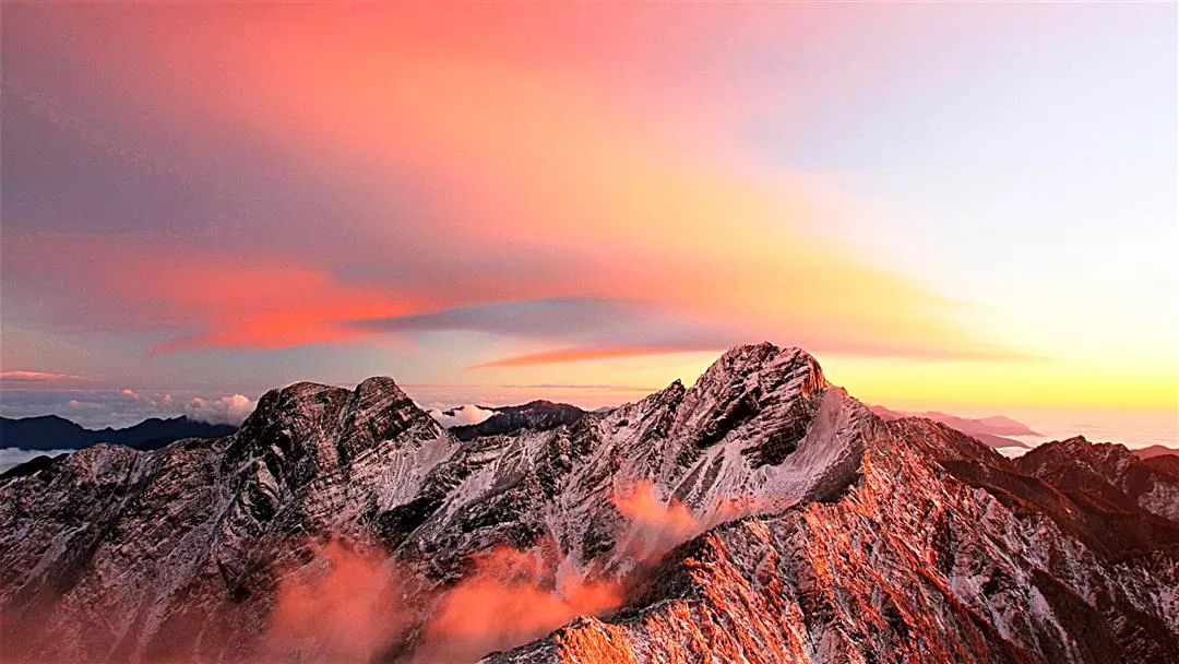 The snowy Main Peak and East Peak of Yushan at sunset.