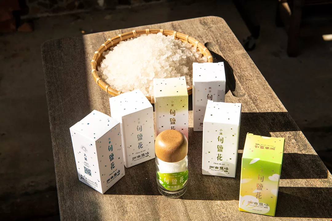 To better understand the relationship between salt and climate, Tsai used worksheets to record details such as salt harvesting dates, temperatures, weather conditions, and rainfall, deliberately distinguishing between algal and non-algal fleur de sel. In 2020 Zhounan launched a series of fleur de sel products whose flavors subtly reflect seasonal changes across the year, named for some of the 24 solar terms of the traditional Chinese lunisolar calendar, such as xiazhi (summer solstice), dashu (“major heat”), and xiaoshu (“minor heat”). Because salt harvesting varies every year in response to changes in the climate, these seasonal salts are also referred to as “climate-change special editions.”