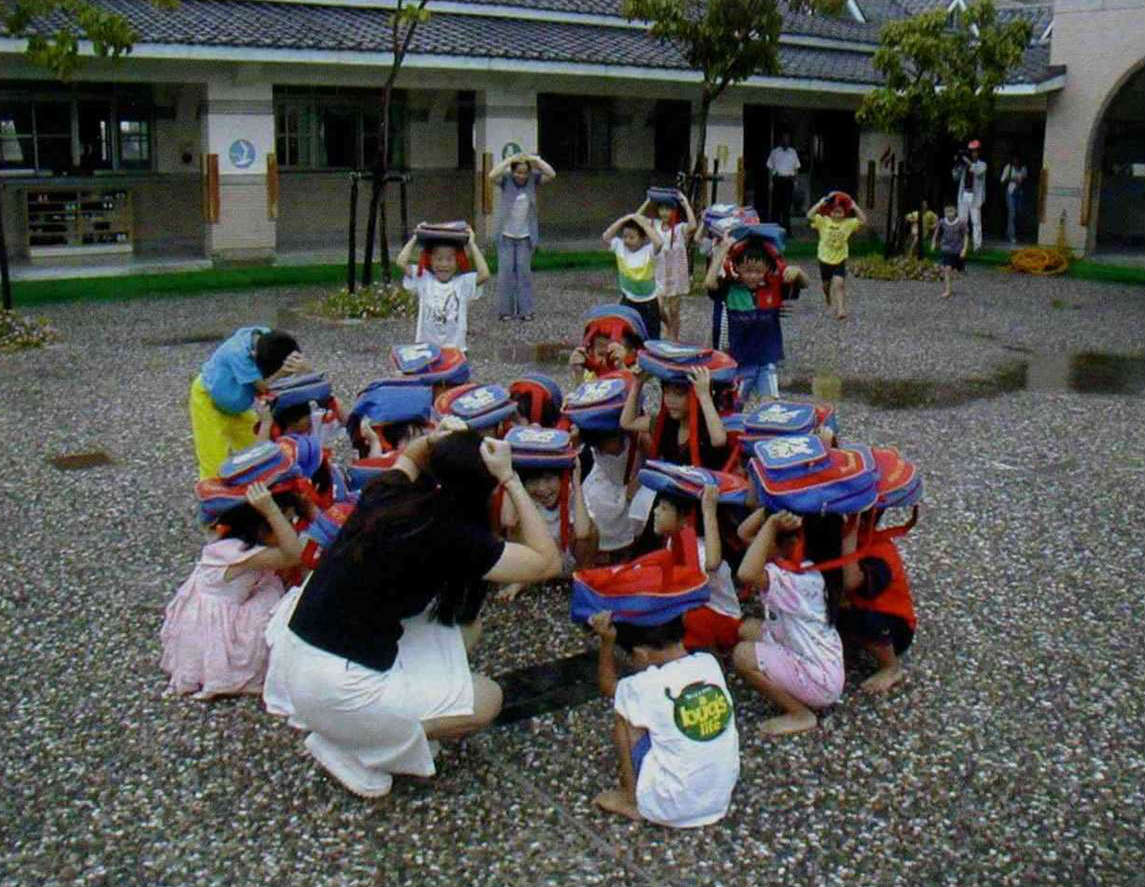 Led by their teacher, these children are in high spirits as they run through earthquake drills. But with broken glass and other objects covering the ground in the aftermath of a real quake, running around in bare feet could be dangerous. (photo by Chen Mu-lung)