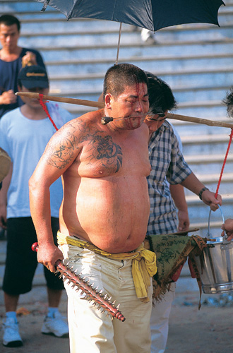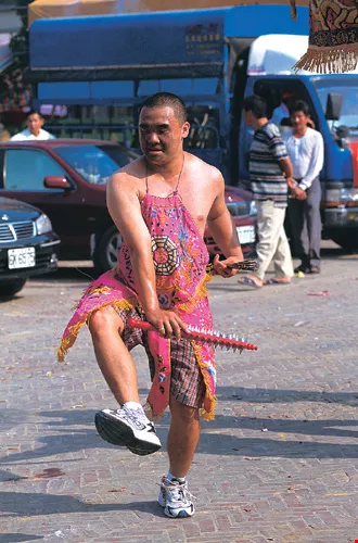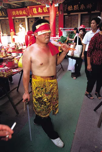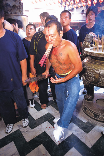 The three spirit-mediums nod their heads fiercely to the enthusiastic accompaniment of gong and drum. Their companions let them ingest the smoke from incense braziers. The spirit-mediums enter into a trance. One of them takes up the burning incense and passes it before his face and over his body. Elderly women looking on cry out in alarm, "Oh! You'll burn yourself to death!" Another of the mediums allows his companion to pierce his cheeks with a 60-centimeter needle. Finally, yet another of the spirit-mediums takes up a sharktooth saw and fiercely hacks away at his backside, the blood dripping down drop by drop....