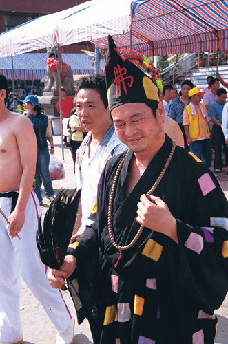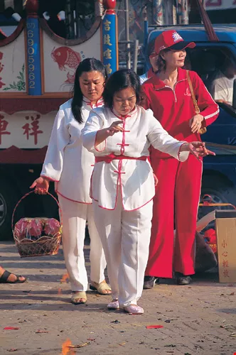 One of them, red-faced as if inebriated, and garbed in the patched robes of the monk known as Jigong (Crazy Ji), holds a palm fan in one hand and a gourd of wine in the other as he staggers up the steps to Sanfeng Temple. Off to one side, a female spirit-medium from another temple wears the green garb of a traditional heroine and imitates the posture of the Third Prince (Nezha) treading a wheel of wind and fire. With one hand upraised, she bounds up the 21 stairs to the temple on her right foot, all in one go.