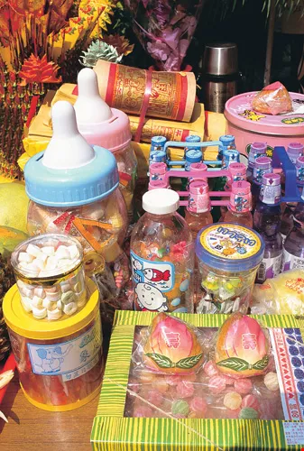 Devotees show that their love for the Third Prince is like the love for a child. Here, they offer up longevity peaches, soda, as well as jars of candies shaped like baby bottles.