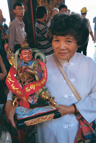 The gods protect humans, and humans care for the gods. This elderly grandmother reverently cradles the icon of the Third Prince, showing how close the relationship between human and divine can be.
