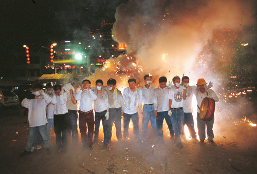After this first round, the staff from Tiantzu Temple arrange a waist-high heap of fireworks in the temple square. The palanquin is to pass right over this heap of fireworks. In front of and behind the heap, a dozen or so youth clasp arms and ready themselves for a fiery baptism. The fireworks are lit, and amidst their fierce flashing, the youth, garbed in long sleeves, long pants, and with no protective headgear whatsoever, do not so much as flinch.