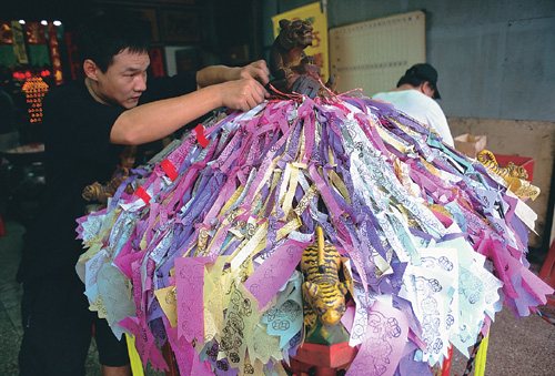 On the day of the god's birthday itself, there is not the commotion of the incense associations, but rather the sight of young and old coming to advance their sacrificial offerings and birthday wishes. On the offering table, aside from the traditional longevity peaches and noodles, one can also find Western-style birthday cakes, some even with candles. More interestingly, one can also find bubble gum, mint candies, toy cars, marbles, and pacifier-shaped candies, all offerings that a child would love. From these thoughtful offerings one can see that, aside from revering the Third Prince, the people show an additional measure of tender love for him. Who knew that there could be such closeness between the gods and the people?