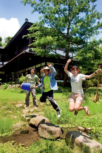 Co-workers Hong Konger Cheng Hiu Tung (right), a student of environmental policy, and National Taipei University economics graduate Lü Jun (center), in front of the beautiful Old Five Guest House with owner Lu Zhenxu. They are greatly enjoying the chance to work amid the beauty of nature.