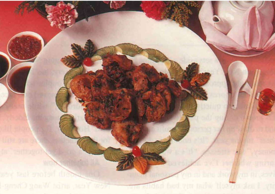 Lunar New Year's Eve is the time to venerate one's ancestors, and as a mark of sincerity one is sure to place on the altar table a whole chicken, a whole duck and a whole fish, along with a large piece of boiled pork, or a round knuckle of pork glistening with fat. Also, in order to have "abundance every year" one is sure to keep the fish head and tail until New Year's Day (the word for "abundance" in Chinese sounds the same as the word for "fish"), and to help it keep that long, the fish used as an altar gift is usually deep fried. After the ancestor worship ceremonies are finished, the sight of all that meat and fish is enough to put everyone off.
