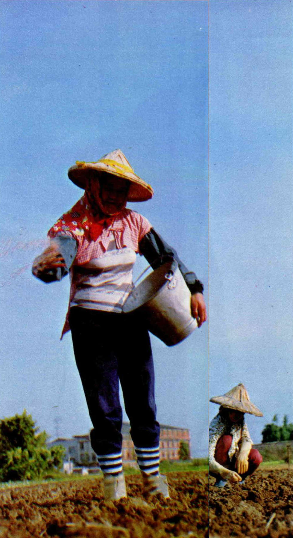 The farmers use "iron oxen" (far left), and heavy tractors (top) to plow the fields. Women at work, the automatic irrigation system and beautiful vegetable flowers create a simple but beautiful picture.