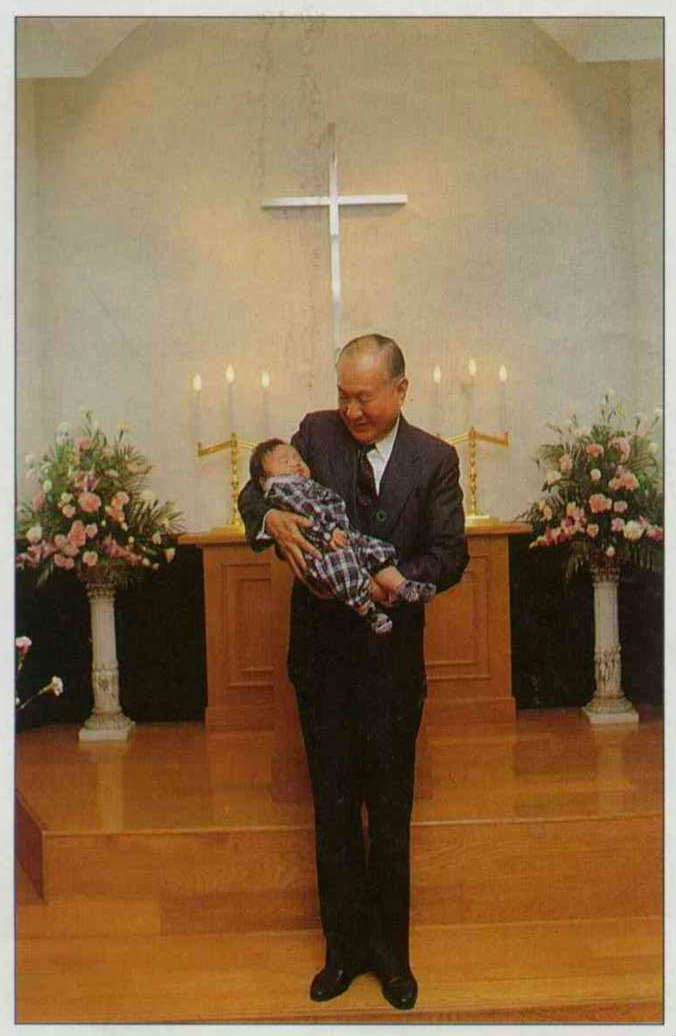 Having passed most of his life in hardship, Li Hai-tien, owner of the Chungking Restaurant, smiles and plays with his grandchild in the chapel he had built in his home.