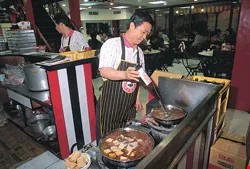 "In those days I really had a motley collection of tables and chairs-no two matched," says Tien, seated in a luxurious villa-style corporate headquarters, describing how he literally climbed out of a trash heap. His once code-violating and ramshackle Huachiang store is today brightly and elegantly decorated in "modernized antiquity" style. It remains the favorite of many old customers, and every time a cold front blows in, folks crowd in, creating a huge traffic jam at the head of the bridge.