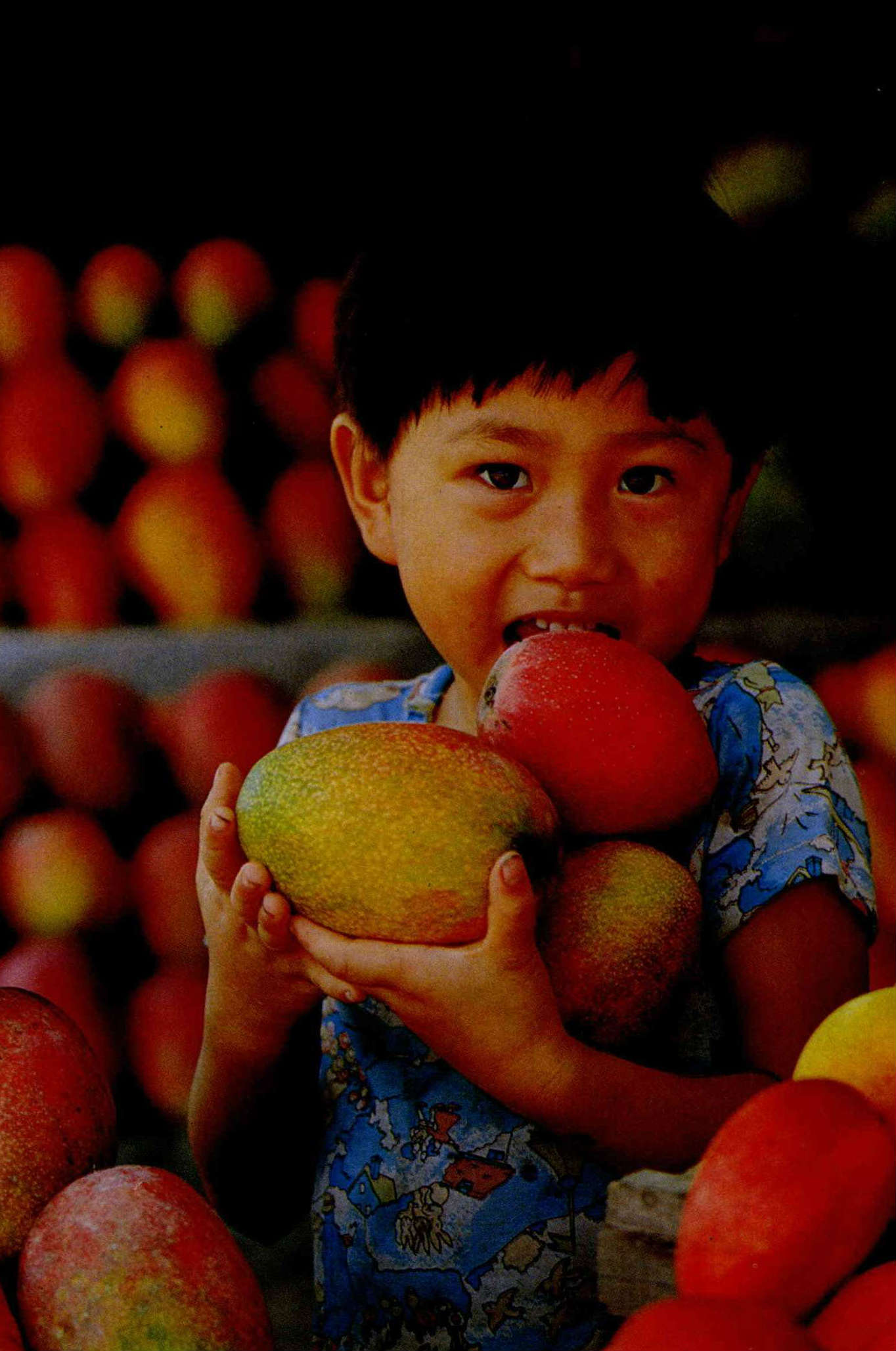 Left: A young boy can hardly wait to get his teeth into a large and tasty mango. Right: The trees of the U.S. strain of mango are low and their fruit is easily collected.