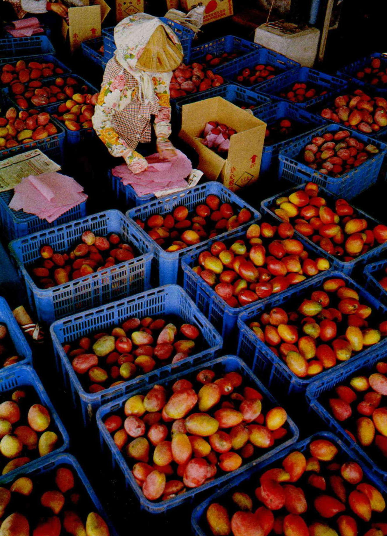1. The indigenous strain of mango was the first to be introduced to Taiwan. 2. Farmers sorting and gathering mangoes during the peak season. 3. In the specialized district for mango cultivation, plastic bags are used to protect the fruit from pests.