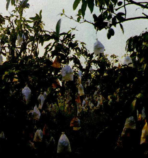 In the specialized district for mango cultivation, plastic bags are used to protect the fruit from pests.