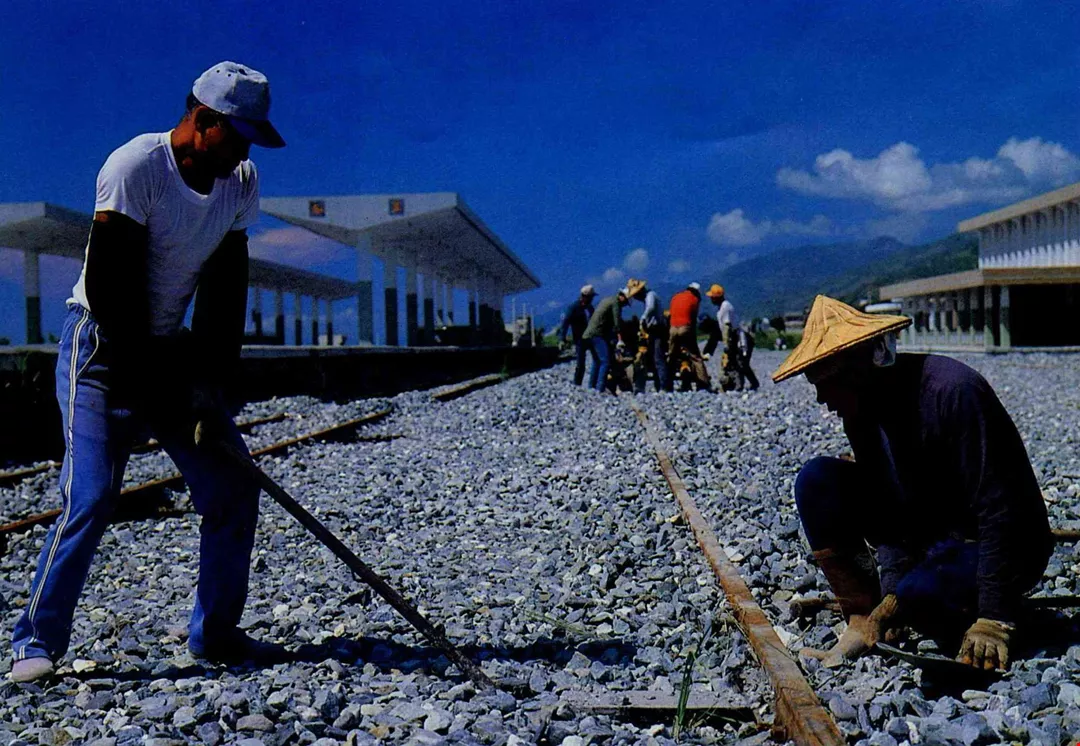 Veterans building the South Link Railway laid track in the hot sun. (pho to by Ch'en Ming-cheng)