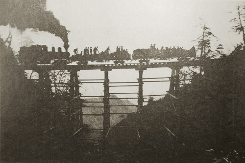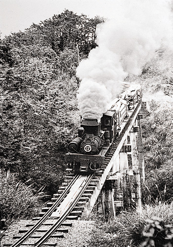 The Tataka Line, running from Alishan to Tatajia near Yushan, was once Asia's highest mountain railway. It was dismantled in 1979 to make way for the New Central Cross-Island Highway. Pictured here is a classic image of the train passing over the highest wooden bridge on the route.