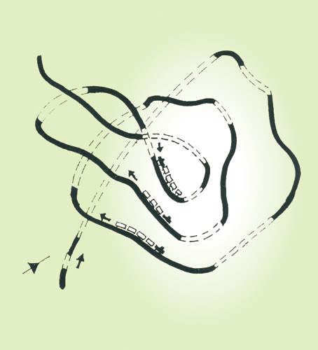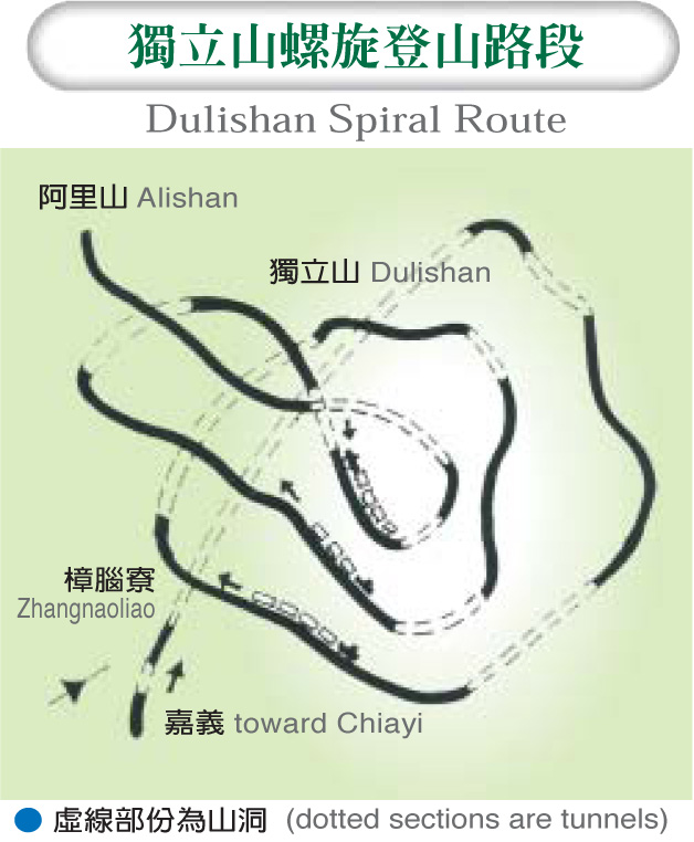 The most advanced railway construction methods of a century ago were used in building the Alishan Forest Railway. Besides employing slip-proof cog rails to prevent the train from rolling downhill at high speeds, the Alishan Forest Railway boasts four carefully designed technologies to minimize the gradient: namely, a mountain route with S- and U-curves, a back-and-forth zigzag route built due to lack of suitable land, a spiral route in higher elevations (see map at left), and specially designed upright cylinders in the engine.