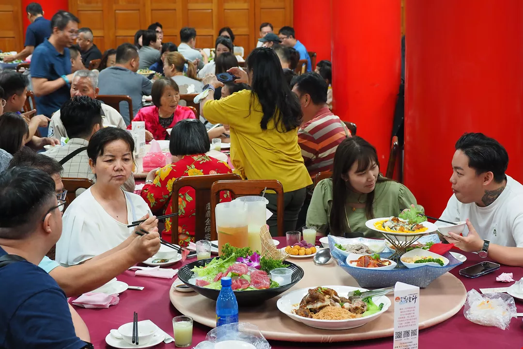 To celebrate Mother’s Day, Tang Fulong, a chef hailing from Kaohsiung’s Neimen District, took it upon himself to cook food for 50 tables at the Fudingjin Bao’an Temple beside Jinshi Lake in Sanmen District. In addition to a tuna slicing show, the guests were regaled with artisan delicacies such as platters of mullet roe and abalone, braised pork knuckle, and fruits laid out on three-tier stands, with dancers and musicians performing on the stage. Families and friends reunited with each other amid this jolly mood, reinforcing their bonds while chatting and pampering each other’s taste buds.