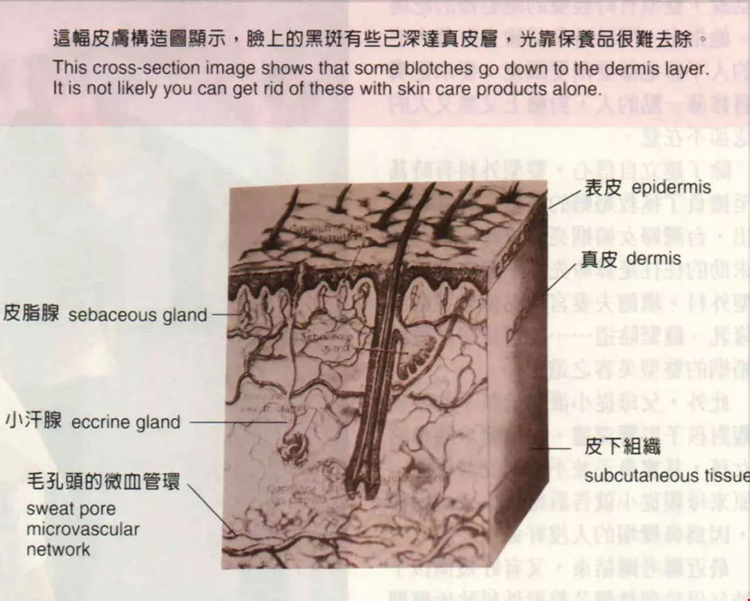 This cross-section image shows that some blotches go down to the dermis layer. It is not likely you can get rid of these with skin care products alone. sebaceous gland eccrine gland sweat pore microvascular network epidermis dermis subcutaneous tissue.