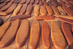 The third treasure, oilfish roe, looks a little like mullet roe, but is larger and thicker. It is prepared by marinating, pressing then drying. Thinly sliced and served with garlic oil and daikon, the roe makes a delicious treat that is slightly gelatinous in texture.
