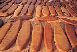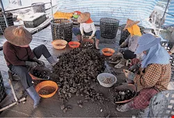 Tungkang in the daytime is quite a sight. The streets are full of the ocean's bounty, set out on racks to dry. Delicious oilfish roe glistens in the sun-drenched lanes, winking back at old Sol. But the dour expressions of the local fishermen seem impervious to this bright scene. "The fishermen are having a rough time of it. Times are tough and they can't compete with China." As mainland Chinese fishermen have improved their equipment, fewer fish are making it back out of China's fisheries. As a result, catches of the migratory fish on which Tungkang depends for its livelihood have declined sharply in recent years. A few old fishermen stand by the side of the road sighing as they look at some NT$2,000-a-pound oilfish roe. "Things are just getting worse," they say.