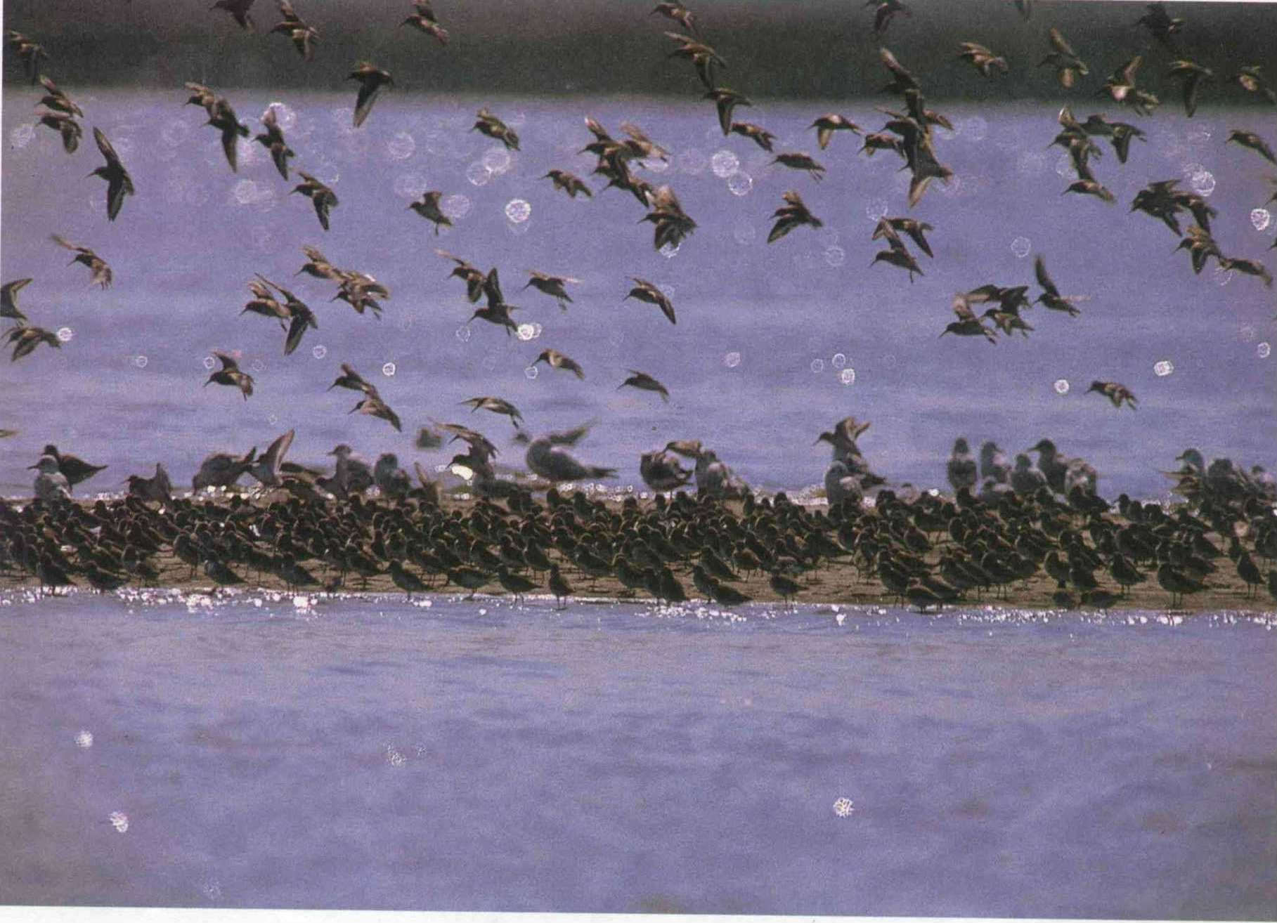 Each year large numbers of birds fly south to Taiwan to pass the winter. Shown here covering the beach and sky are Pacific dunlins. (photo by Kuo Chih-yung)