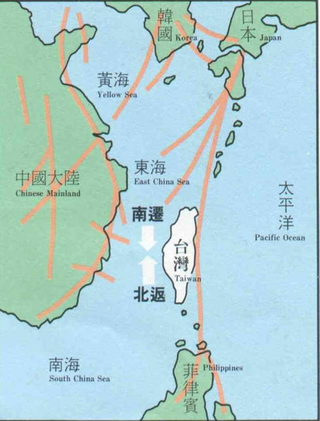 Semitropical Taiwan is an important rest stop for many birds migrating north and south in East Asia. From the migratory route maps published by foreign scholars in the past and the studies of Chinese scholars in more recent years, it is evident that the hundreds of thousands of migratory wild geese, ducks, and gulls that visit Taiwan on their way south in the winter actually originate in Japan, Korea, Manchuria, Siberia, and Mongolia.