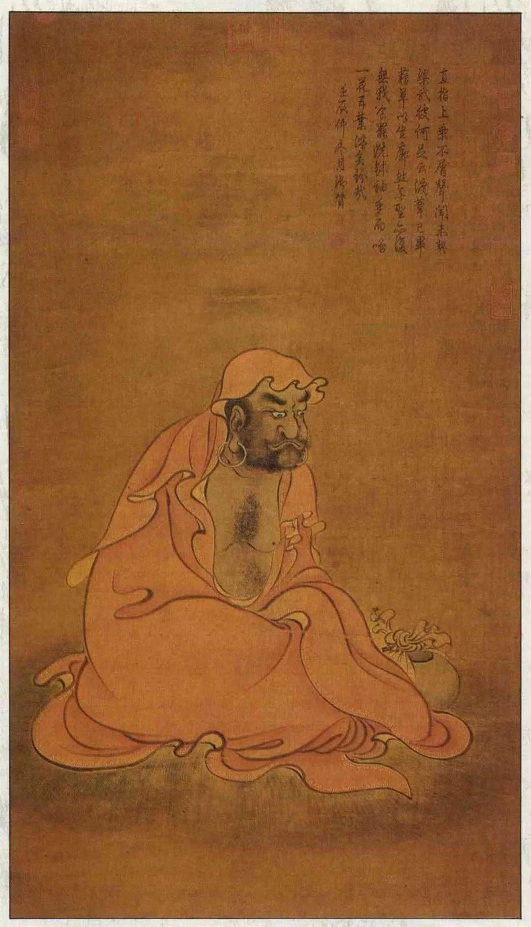 This Sung painting of Bodhidharma is the oldest image of him in existence. His eyes are downcast in an attitude of inner contemplation; in contrast to the angry outward stare of a modern-day Bodhidharma picture. (photo courtesy of the National Palace Museum)
