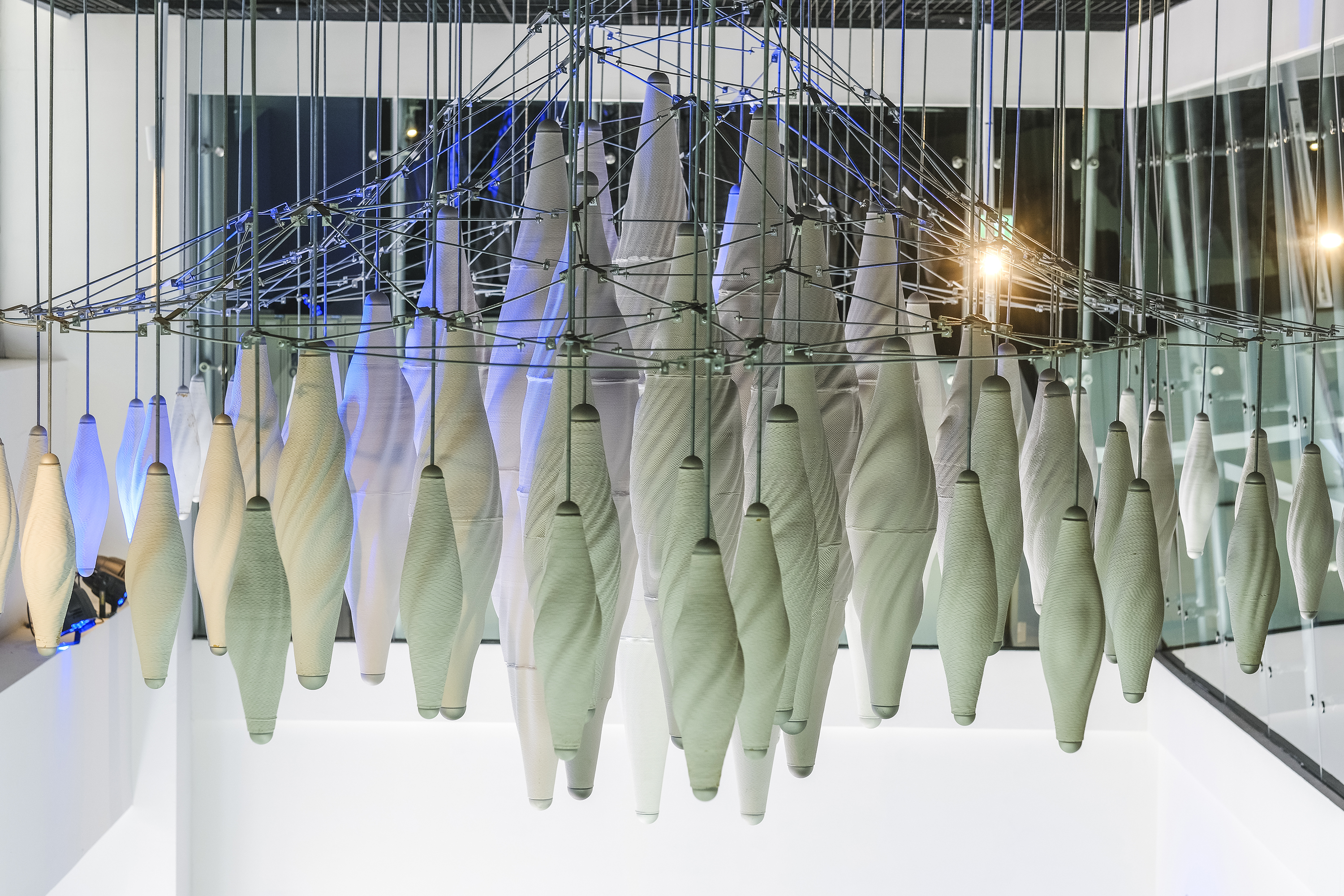 As a forum for interacting with the public, D/S One strives to be a comfortable space. One of the first things you notice on entering is the calm atmosphere created by its minimalist design. As you climb the stairs, an array of large white objects hanging from the high ceiling catches your eye. Collectively an art installation called Yinyun, each element in the array is 3D printed from white porcelain and recycled coal ash and decorated with a pattern derived from electric power data. The work, which earned artist Kamm Kai Yu a bronze A’ Design Award, transforms invisible electrical energy into sculpture, and reuses coal ash to illustrate the value of the circular economy. D/S One’s second floor houses temporary installations such as Faramita, a work by Lin Shu-yu that uses flowing water to open a mechanical flower as a way to represent the process by which water generates renewable power. Viewers are invited to pour water into the installation’s mechanism, triggering a process that demonstrates the relationship between energy and the lifecycle of a flower, and the coexistence of nature and technology.