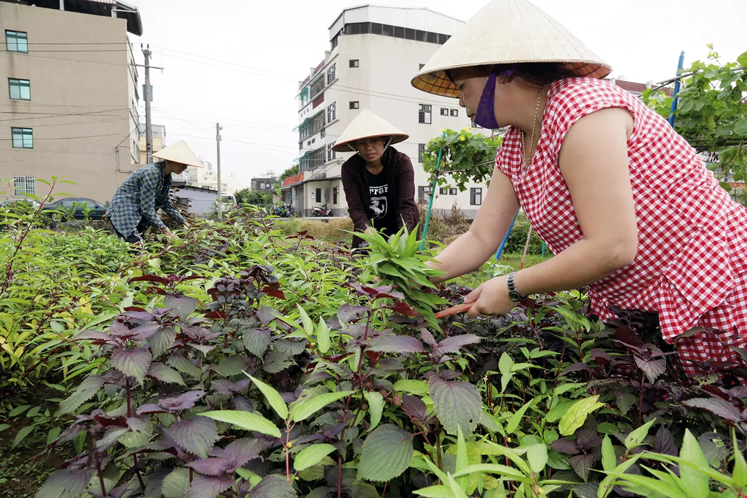 Tran Thi Hoa and migrant workers awaiting repatriation tend their vegetable garden. (photo by Jimmy Lin)