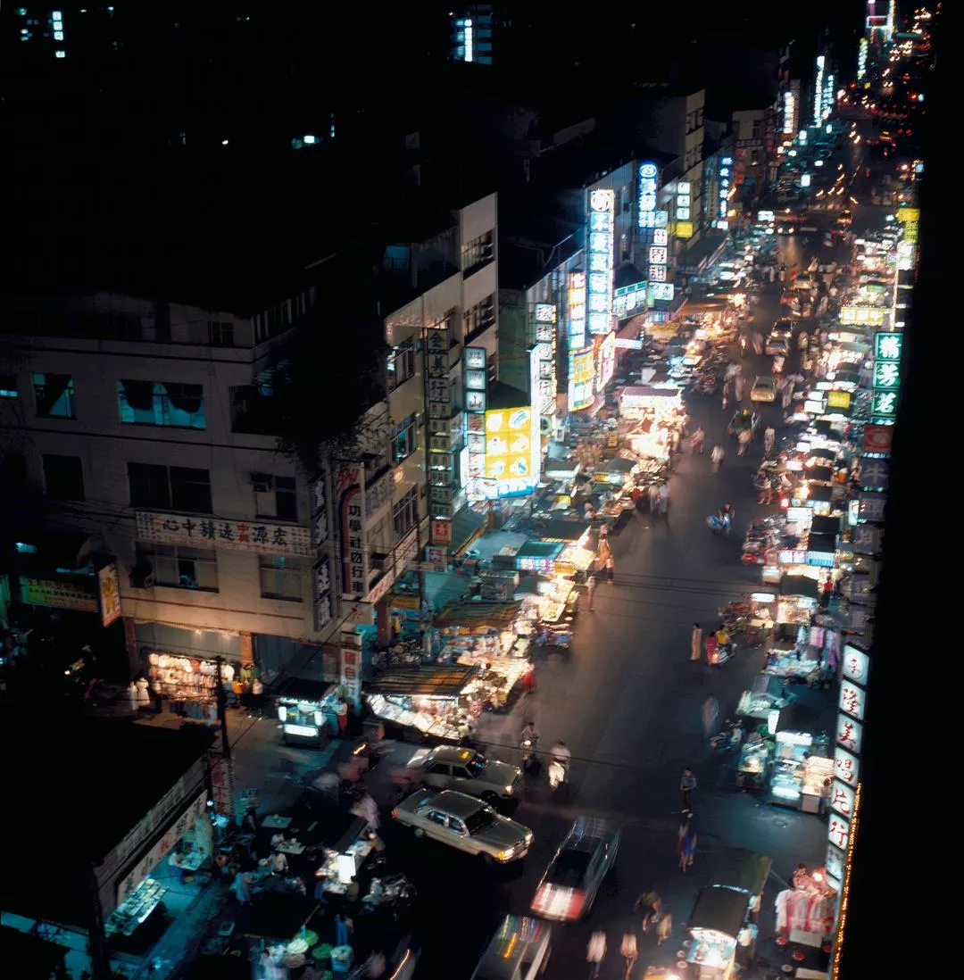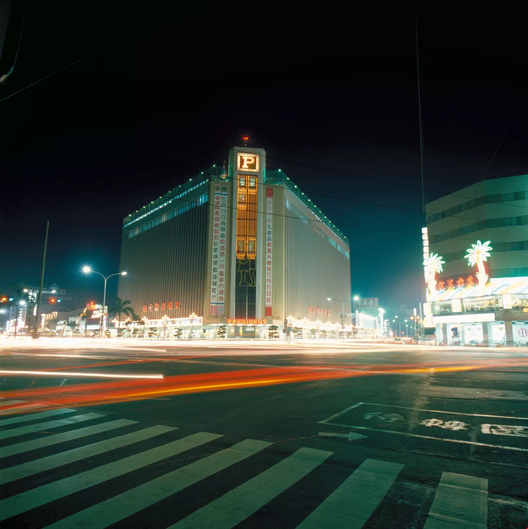Kaohsiung city at night, illuminated by lights: 1. The Tat'ung Department Store. 2. A night market at Liuho Street.