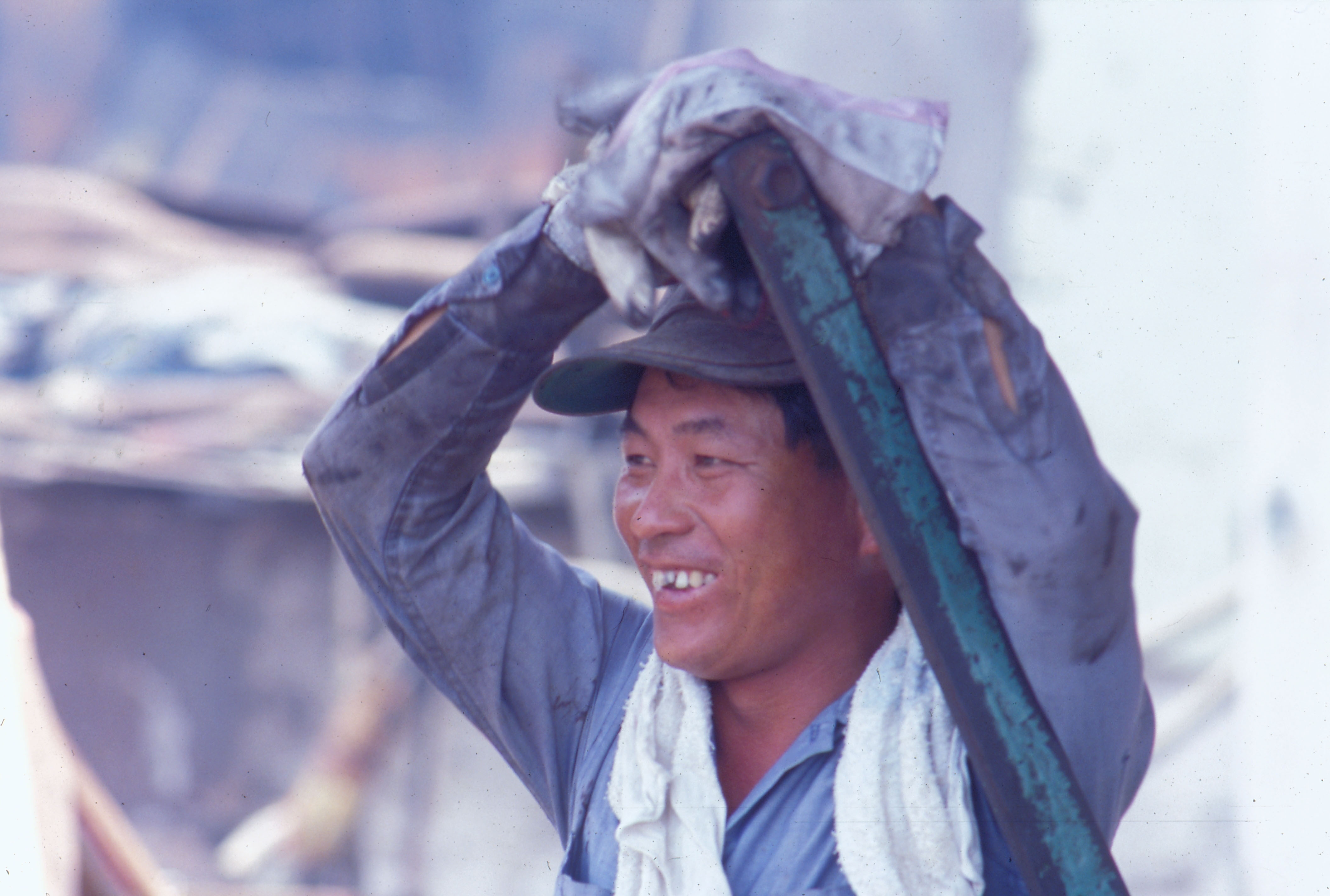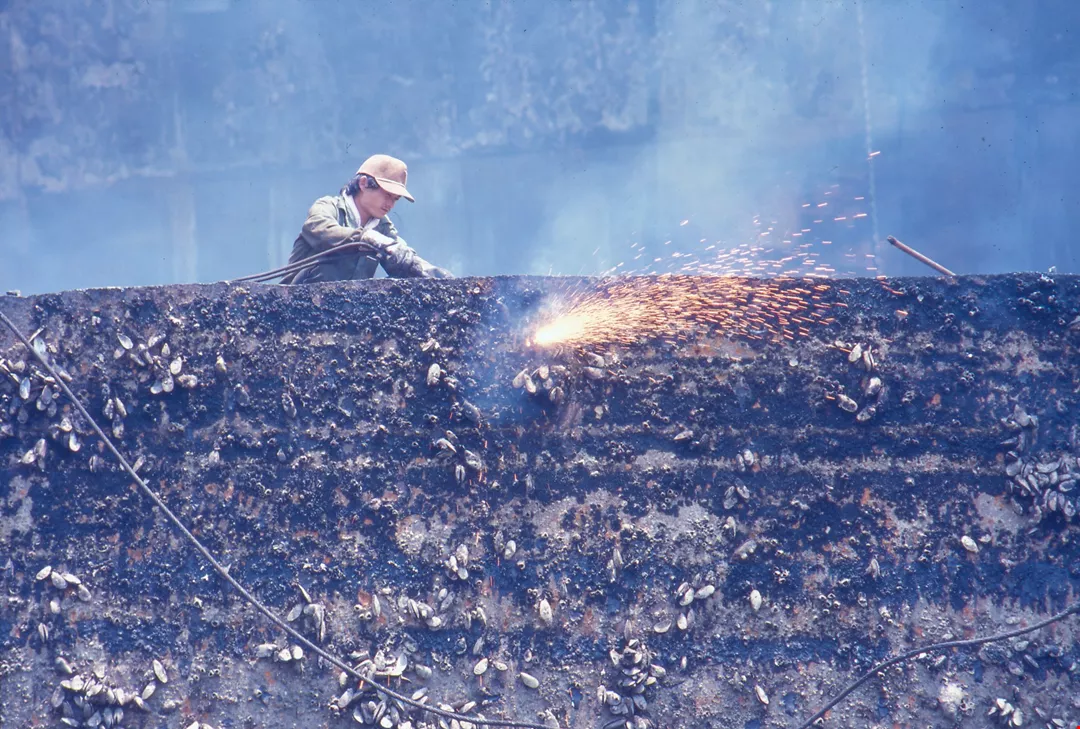 5. Shipbreaking is one of Kaohsiung's major industries. Shown is a worker dismantling a ship's steel shell.