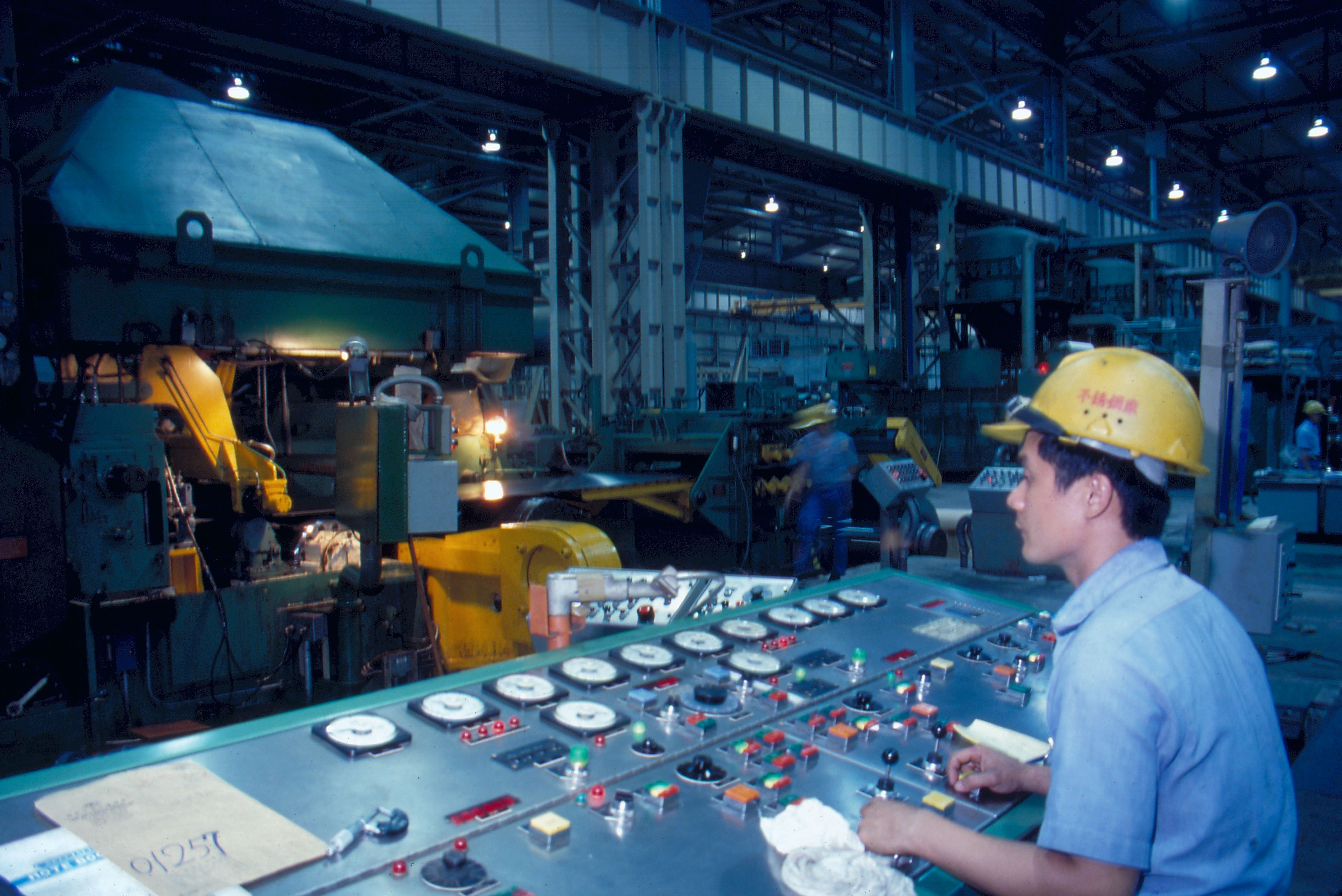 1.2.4. Three of Kaohsiung's large government-run factories: The China Shipbuilding Corporation. (1) The China Steel Corporation. (2) The T'angjung Iron Corporation. (4) 3. Industrious workers are the force which powers Kaohsiung's progress. 5. Shipbreaking is one of Kaohsiung's major industries. Shown is a worker dismantling a ship's steel shell. 6. Dense high-rise buildings overlook the city.