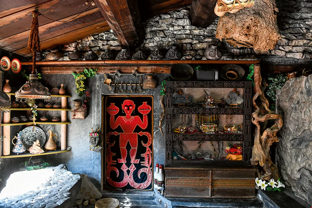 Passing by the stone slab home of the chief of Adiri, you see ancestral spirit pillars, woodcarvings of ceramic vats, and woodcarvings and paintings of the legend of Balenge ka abulru, in which Princess Baleng marries the Hundred-Pace Snake deity. The architectural vocabulary of the building indicates the status of the chief within the community.
