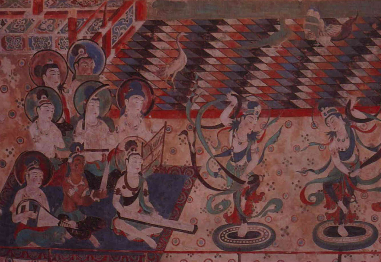 Music is one of Mahayana Buddhism's main means of encouraging salvation. Images of music-playing spirits and bodhisattvas, flying through the air, abound in the Buddhist cave paintings at Dunhuang, while the classic texts of Buddhism describe paradise as filled with the sound of heavenly music. Buddhist scripture records that Sakyamuni, after attaining Buddhahood, decided not to evangelize directly because he felt the dharma was too abstruse for ordinary people to comprehend. But Indra, wanting to ensure maximum exposure for the dharma, had the disciple responsible for music give a special performance for the Buddha, as a way of appealing for his compassion. Buddha was duly moved, and thus commenced his 49 years of preaching.