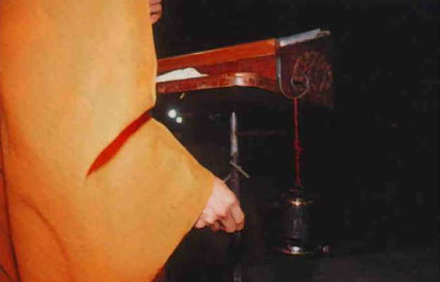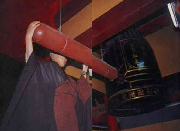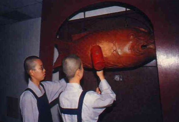 4:30 a.m. at the monastery, and the first glimmers of dawn are showing in the East. The monks awake to the steady beat of a wooden clapper. They dress, go to the washroom, and prepare for another day-all without speaking. The clapper stops and is succeeded by the chiming of a bell, which can be heard for miles around. Then comes the pounding of a drum, and the monks briskly head to the hall for their first class of the day. They won't exchange a single word until after breakfast, so as not to disturb their spiritual concentration. Clapper, bell, drum: simple percussive instruments that provide the music to which the monks begin their daily devotional routine. As Hsin Ting explains: "For living beings, hearing is the sharpest of the senses. Sound is the most effective means in Buddhism for probing the hidden recesses of the mind."