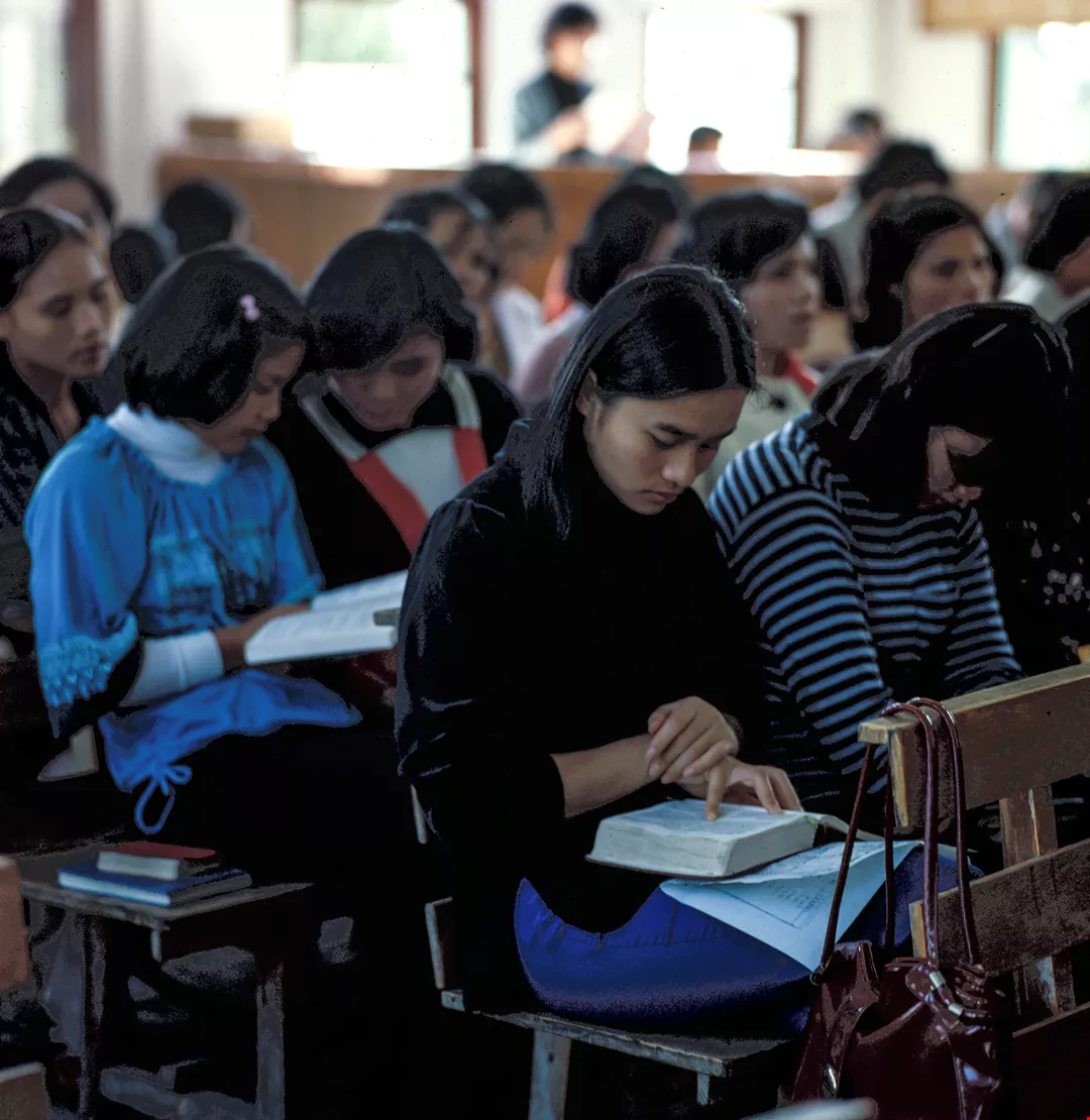 The Grace Baptist Church is a primitive and elegant architecture. Opposite: Pastor Chou Lien-hua giving a testimonial at a Sunday worship.