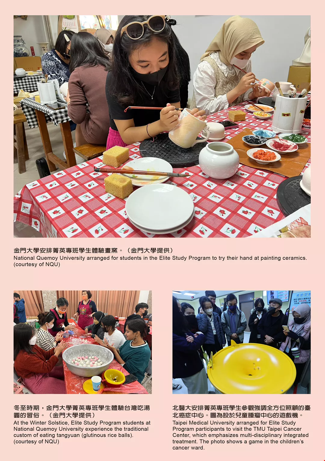 Kinmen-based National Quemoy University (NQU) allowed students in the Elite Study Program to take six credits (three classes) from among all the courses offered at the school. Dr. Yvonne Yu-fang Yen, dean of NQU’s Office of International and Cross-Strait Affairs, states that as a result of Kinmen’s unique geographic position and history, NQU not only arranged for the students to study Mandarin but also to experience Kinmen’s distinctive Minnan (Southern Fujianese) culture and customs .