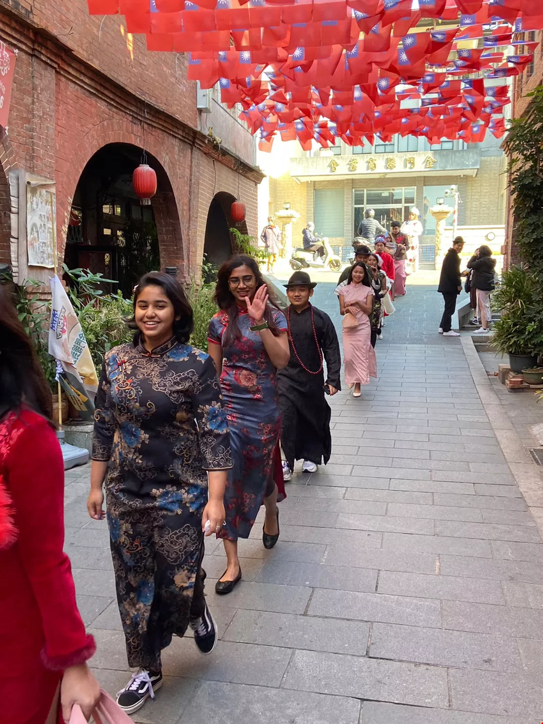 Dressed in traditional Chinese clothing, Elite Study Program students at National Quemoy University gather for a group photograph outside the historic Qing-Dynasty military headquarters on Kinmen. (courtesy of NQU)