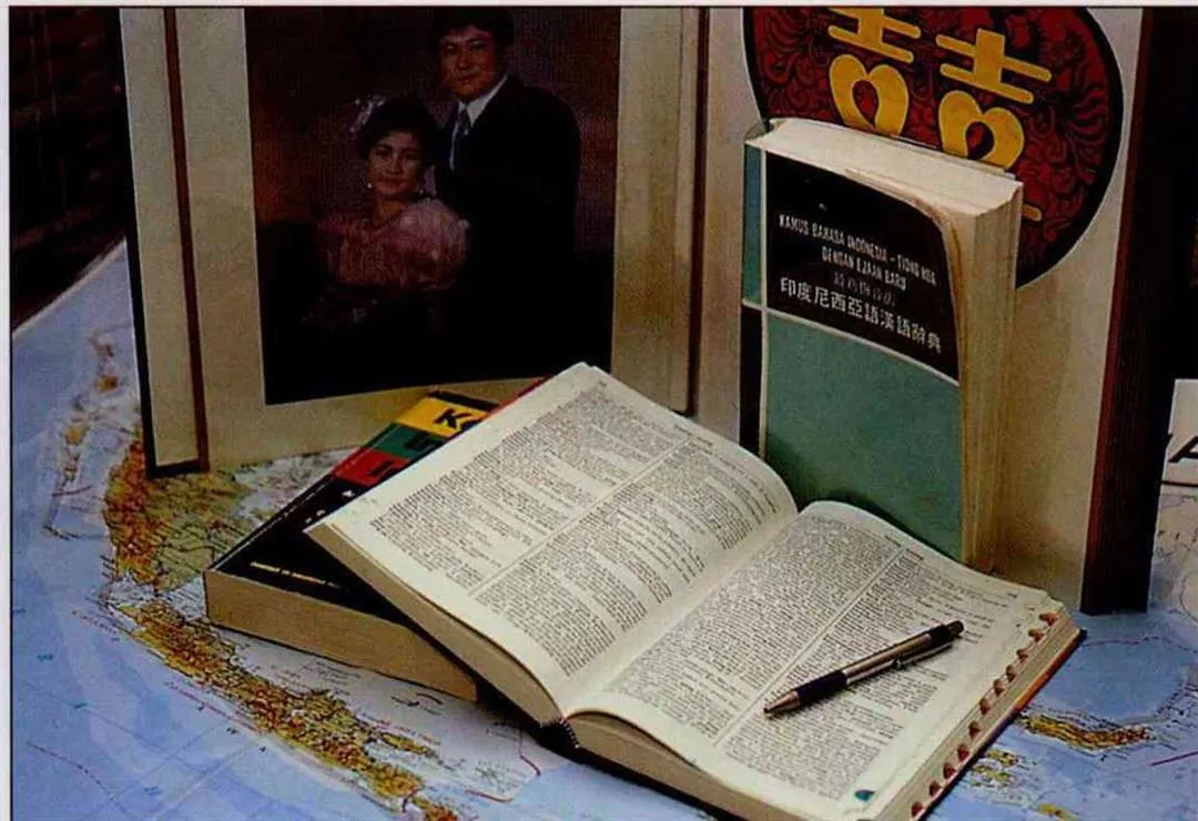 Although both are "Chinese," twenty or thirty years of upbringing in different countries inevitably leads to occasional breakdowns in communication. The conscientious husband uses a dictionary to help both sides fully under stand one another.