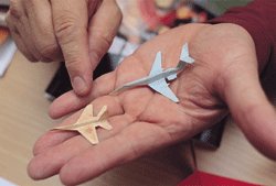 "What's original with me is that after folding the wing into a very normal flat shape, I improved the structure by further folding the wings into triangle shapes that attached to the middle of the fuselage. Finally, there is the square fold of a stabilizer wing beneath the fuselage. That was the most difficult part. After I came up with these original folds, a great number of designs could be modeled on them," Chuo says with great confidence. Now when he sees any kind of plane he is able to fold it perfectly without fail.