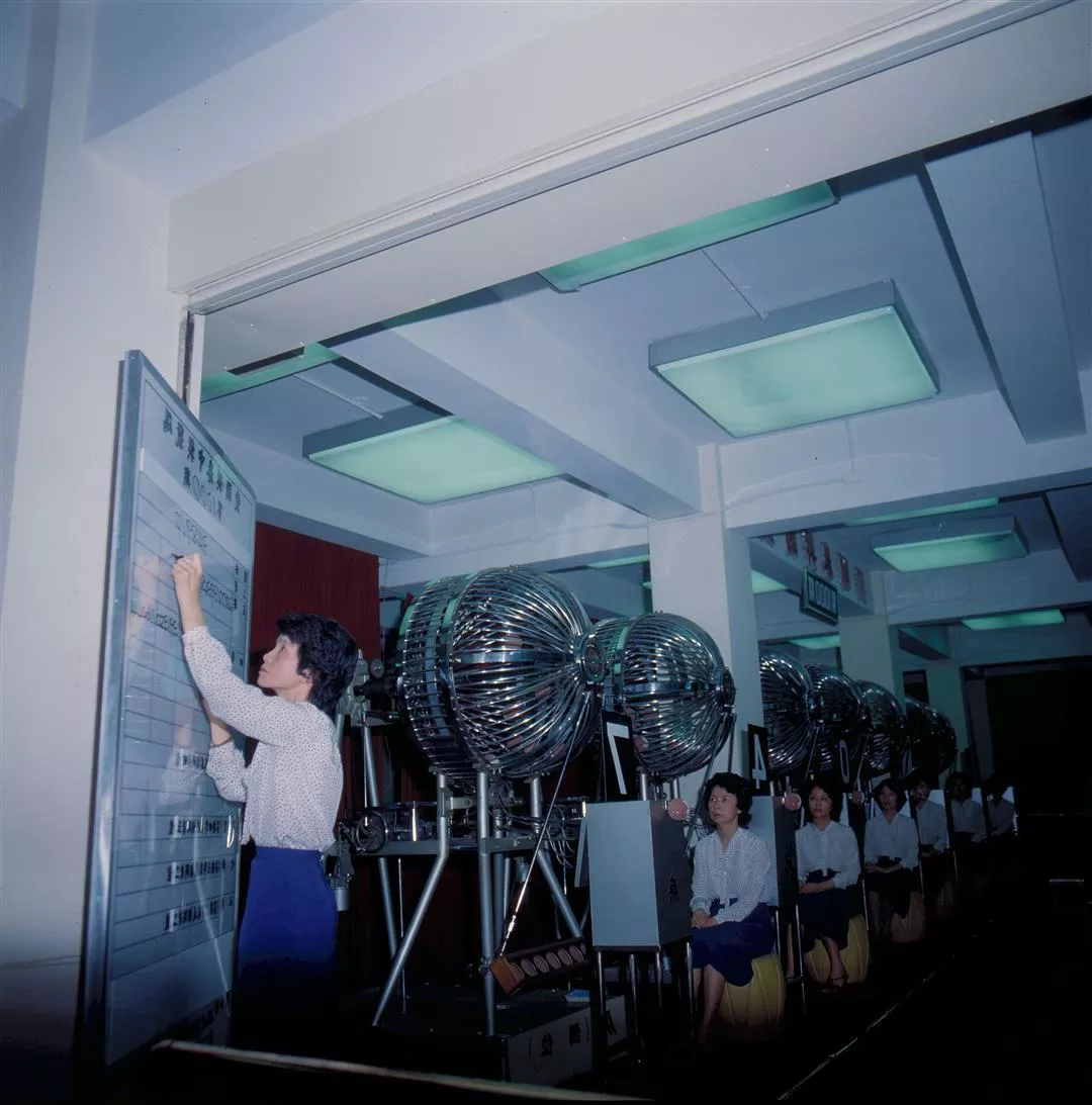Employees of the Bank of Taiwan inspecting tickets printed for the next drawing.