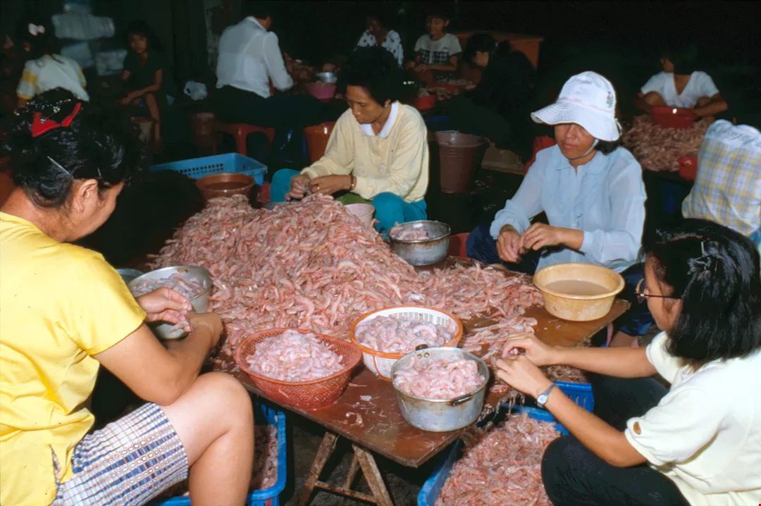 Housewives shell shrimp while chatting over the market products. Peeling shrimp is a good means of making money and catching up on the local news.