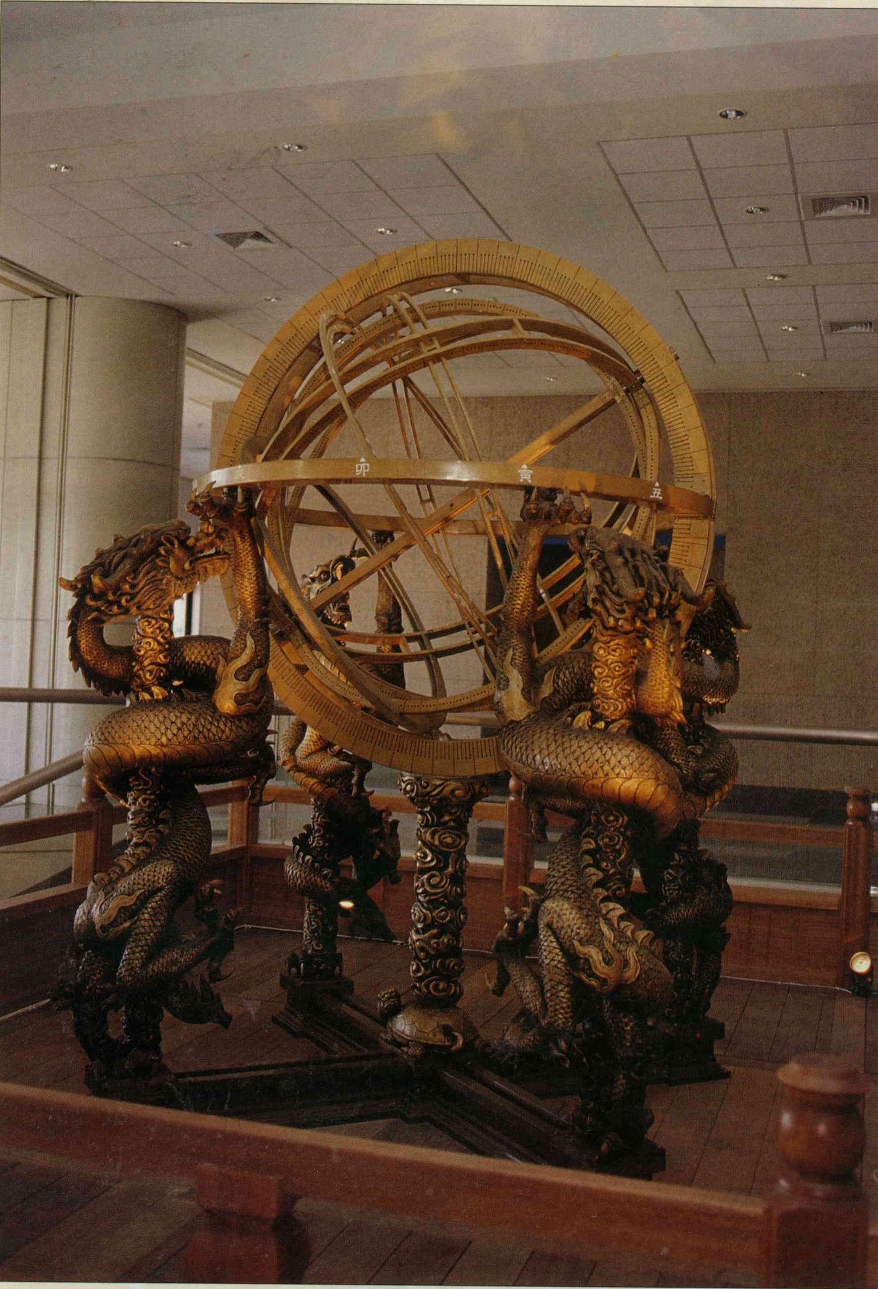 The dragon has appeared on Chinese artifacts throughout the ages. This is the model of a fake Sung armillary sphere on display in the Taichung Natural Science Museum.